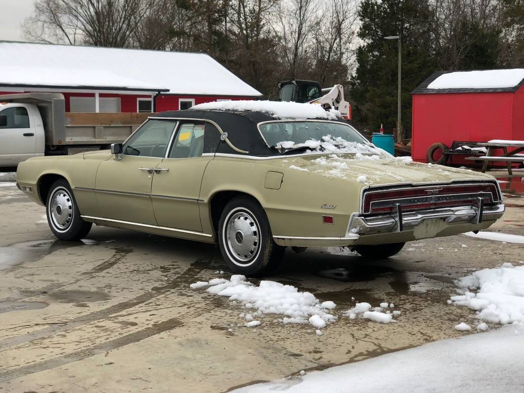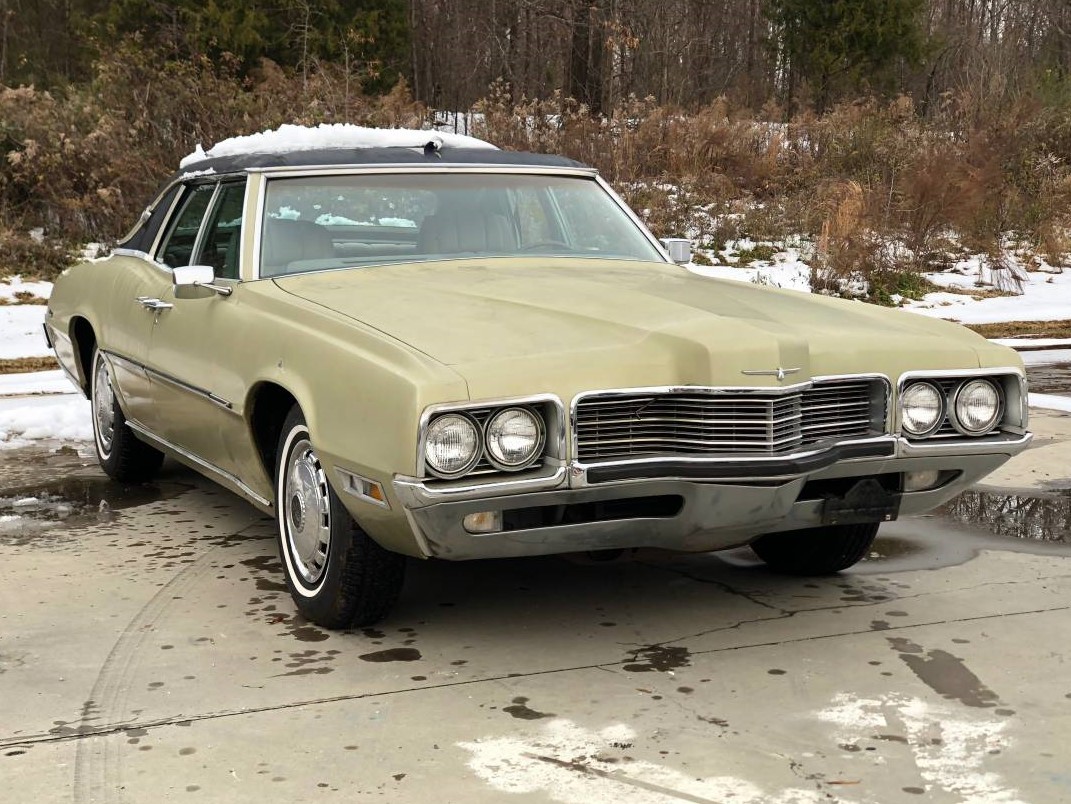 My first car was a 1971 Ford LTD 2 door hardtop in this very same color combination, Gray Gold Metallic paint with a black vinyl roof. This car is in original condition and has only had two owners since new. It is equipped with front bumper rub strips and rear bumper guards. In 1971 the Four Door Landau, with suicide doors, was in its last year. The seller even says it’s not pretty, but it doesn’t look too bad in the pictures. There appears to be a minor indentation on the fender over the right front wheel opening. The paint could probably use a good polish but I don’t see any rust or thinning of the paint. It’s hard to tell the condition of the vinyl roof with the snow on it, but I think there is a rip near the center front of the top. This is also the last year of sequential turn signals on Thunderbird.