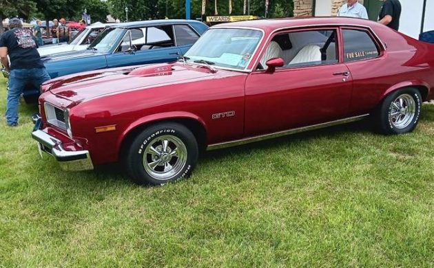 I always liked that Pontiac front end treatment over the Nova for the 73-74. A case of black SEM vinyl spray dye would do wonders for the interior. Then release the pressure in the front 5 mph bumper shocks to bring that bumper in 3-4″ and weld it to clean up the ugly overhang, for openers.