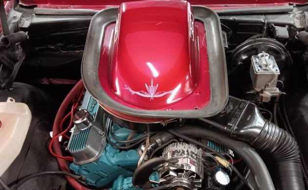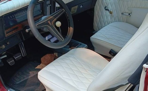 The interior has been significantly personalized with tufted seats, dash, headliner and rear seats. The white is bold and bright in contrast to the red exterior. I wonder how appealing this “period correct” modified interior is to a buyer today. A big plus to this car is its 4 speed transmission which you can see in this picture along with three pedals under the dash. The seller states that the car has 75,000 original miles and just replaced the tires, fluids, valve cover gasket, shocks and battery cables. Also the fuel system, cooling system and brake system has been serviced with many parts replaced.