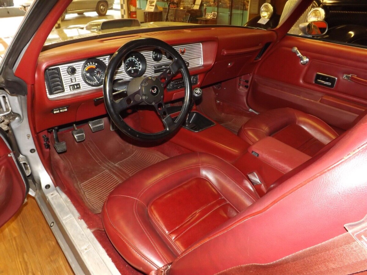 This Trans Am has a red deluxe interior based on the configuration of the seats and door panels. These Pontiac bucket seats were also found in the Grand Prix and are often called “horse collar” seats because of the way they wrap around the driver. The interior pictures indicate manual windows, no tilt steering, and no air conditioning. The black steering column and Formula steering wheel stand out against the red interior. It was not until late 1977 or early 1978 that Pontiac started color-matching the steering column and steering wheels in Trans Ams. The car is said to start and run well. The only flaw on the interior is a rip in the driver’s seat.