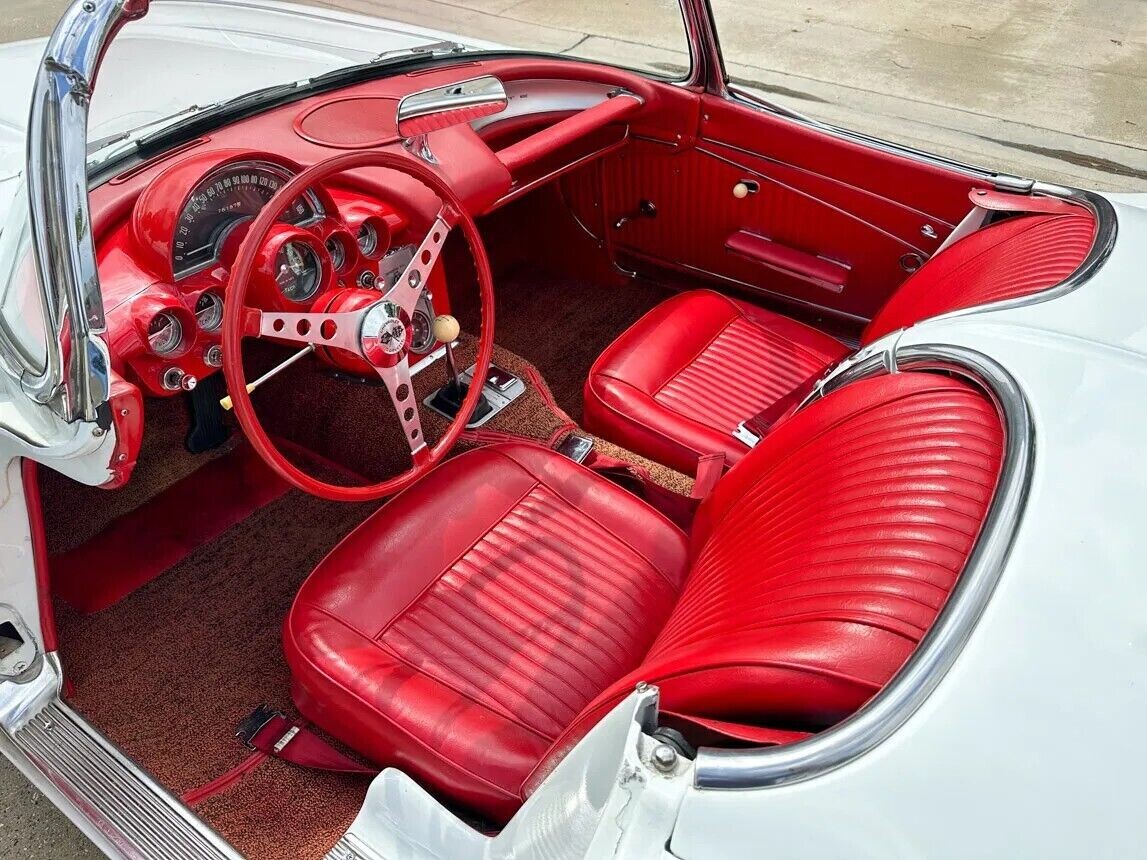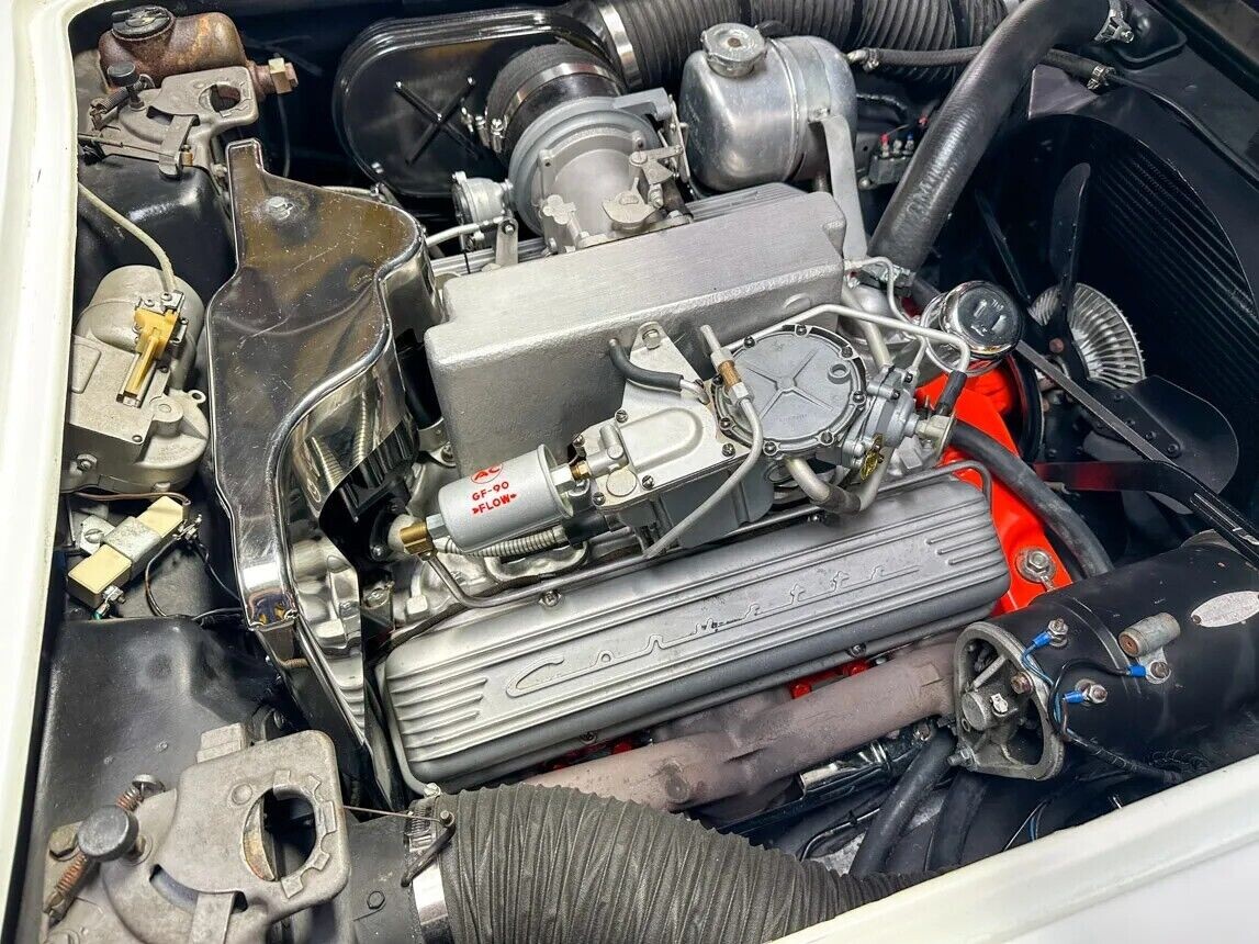 Ordering a 1962 Corvette in White brought Black, Red, or Fawn interior trim. This car features striking Red vinyl that is in as-new condition. There are no signs of wear or other issues, with the vehicle carrying the hallmarks of one that has been treated respectfully. The carpet is excellent, there is no wear on that beautiful wheel, and the bright trim is flawless. It has avoided the plague of aftermarket additions, which adds to the appeal. The original Wonderbar radio should relieve boredom on long journeys if the occupants tire of the tune produced by the sweet V8 under the hood.