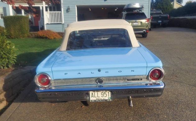 Ford’s everywhere Falcon was by all measures an enormous success when introduced in 1960. It was a leader in the burgeoning compact class and sold in huge numbers. Dowdy-looking? At first, yeah, sort of, but it was envisioned as the antithesis to massive chrome-laden barges that were dominating the U.S. carscape. Sure, the big rigs were popular and still sold in enormous volumes, but American Motors and Volkswagen showed there was a viable path for smaller, plainer, more economical cars. For ’64, the Falcon was offered in Sprint trim (two-door hardtop and convertible); Futura trim (two-door hardtop, sedan, convertible, and four-door sedan); and, finally, the standard Falcon (two- and four-door sedans). Station wagons in Squire (faux wood paneled) and standard Falcon trim were part of the lineup, too. Total Falcon output exceeded 275K units in ’64, but only 4,200 were Sprint convertibles – not rare, but certainly uncommon. The listing for this car is an ode to the saying, “Mum’s the word,” stating simply, “Restored 64 Falcon Sprint… everything pretty much new or rebuilt.” OK, it looks good, a deep finish, no observable rust or body panel damage, a very stout underside, and a like-new folding top with a clear plastic window. The original wheel covers are still in place and haven’t been chucked for something aftermarket – always good to see.