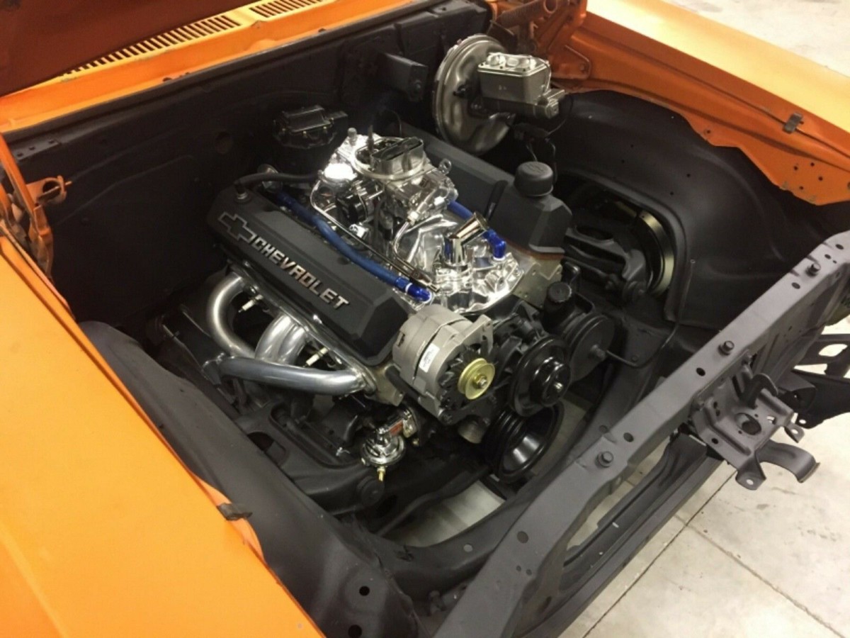 The interior is the typical spartan Nova interior but the white shift knob sticks out revealing a Muncie M21 4 speed shifter. The rest of the interior is brand new except for the dash pad and headliner. The car has rebuilt disc brakes up front and a 3:36:1 rear end. The Nova has a built small block 400 cubic inch engine that has been destroked to 353 cubic inches and has headers, aluminum heads and Keith Black pistons. It should get up and go.