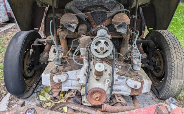 It’s still got a battery in it, might need charged. That flat 4 has duel carbs, maybe a Corvair engine would fit in there. I don’t see any rust holes in the body, the floor pans are gone and rust on the bummper. Some one with big bucks could bring it back to life, not me.