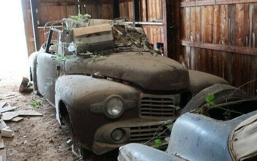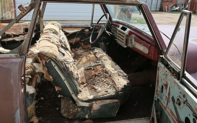 The interior wins today’s “What in the Sam Hill happened in here?” award. I suppose some of this is what occurs when a car sits for years with its top in the down position. I’d suggest serious rodent residency is probably the cause and I imagine the wiring hasn’t fared any better – but being 70+ years old, the wiring probably has had its own age-related hi-jinx to contend with. The one-time, beautifully crafted instrument panel has certainly seen better days and the original radio is, not surprisingly, missing. There is one up-close image of the floors included and it shows them to be solid.