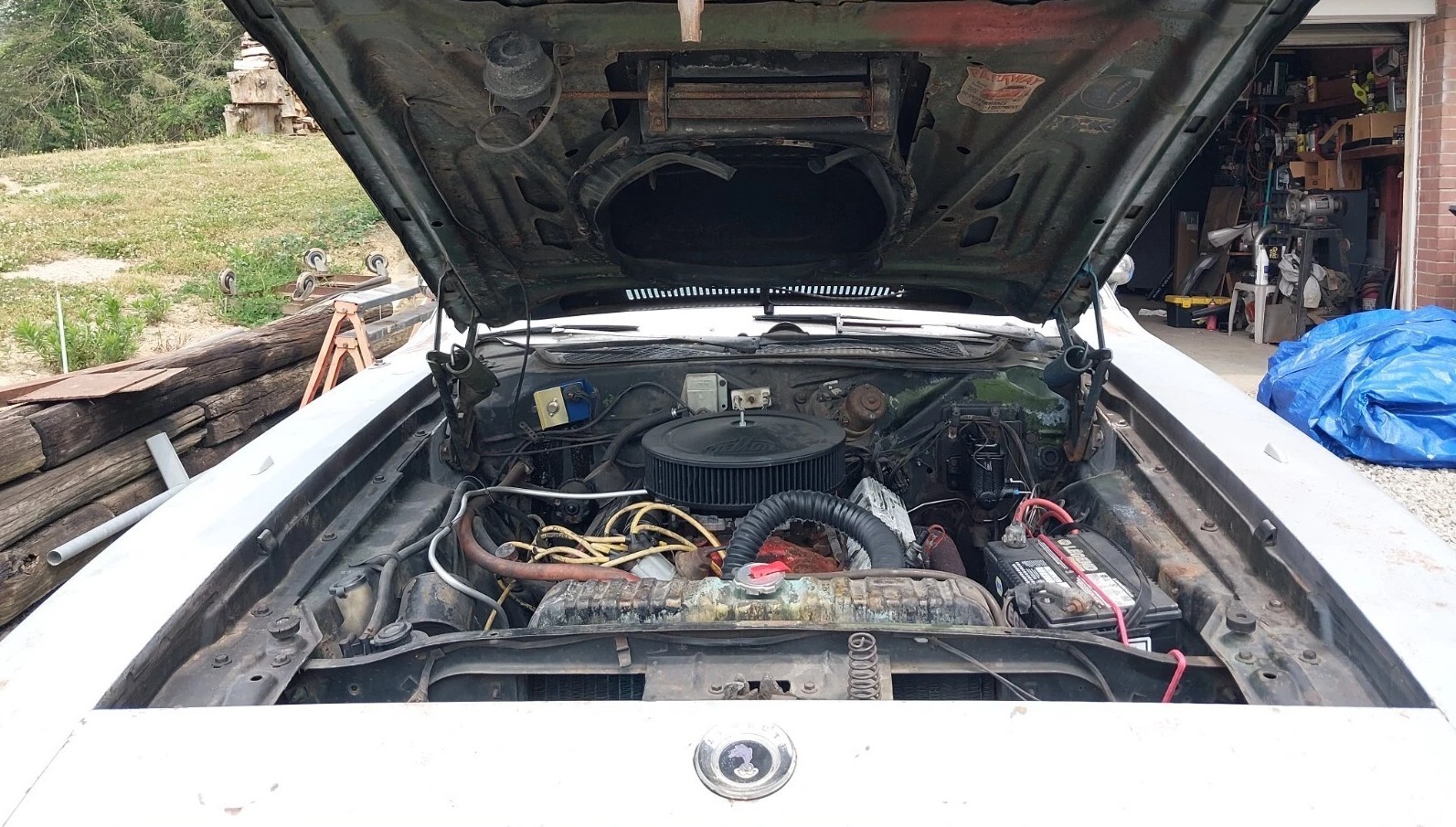The last thing you should do after applying primer is to let the car sit. Primer does not protect the metal, it provides a better surface for the paint to adhere too. As you can see, rust is showing its happy face right through the primer and this car is a barely concealed MoPar rust bucket. That engine compartment and thus the engine have seen better days too.