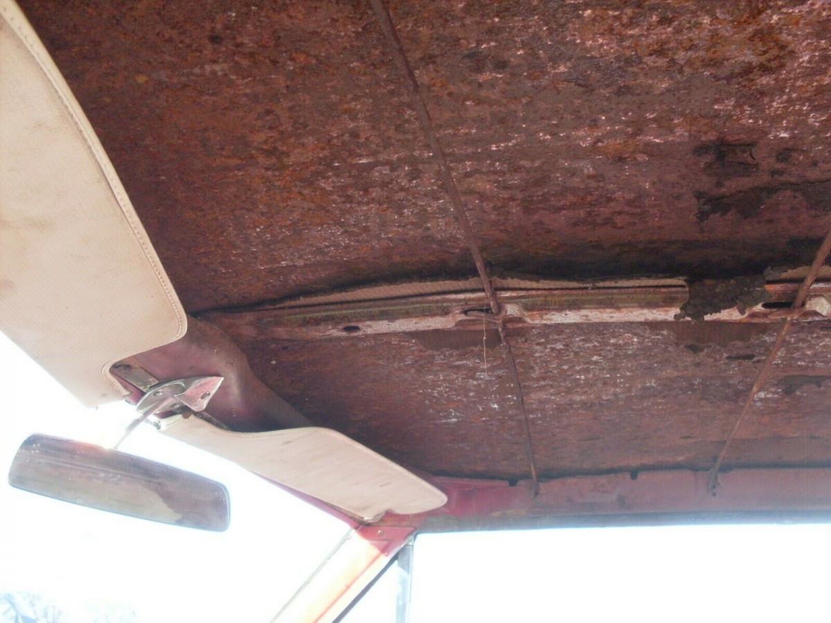 The car sports a black over white two-tone paint job which the seller gives low marks on. The driver’s side rear quarter is “wavy” suggesting a poor bondo job having been executed at some point. The biggest challenge is the roof. There are holes along the top of the windshield trim and water gets into the car. That has no doubt led to the rustiest insides of a roof I’ve seen in a while (the headliner is long gone). The interior is going to need a makeover with the upholstery being shot, at least on the front bucket seats.