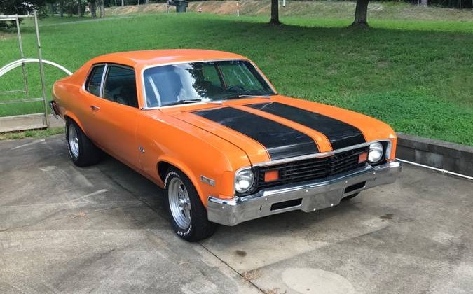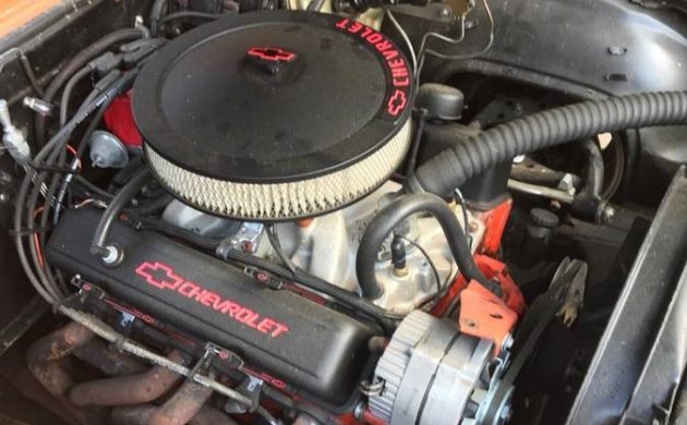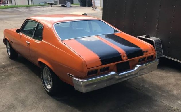 The seller refers to this Nova as a ‘street rod”, but its appearance doesn’t fit my image of what that conjures up. The orange paint and black stripes help, but this Chevy could just as well pack a six-banger under the hood. What’s there instead is a 400 cubic-inch small-block with some bling that doesn’t depend on an abundance of chrome. That motor is paired with a TH-350 automatic that may be stock.
