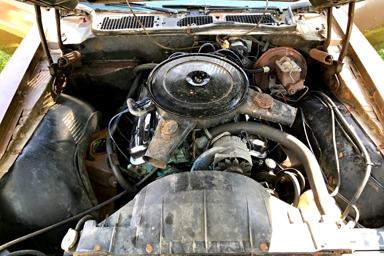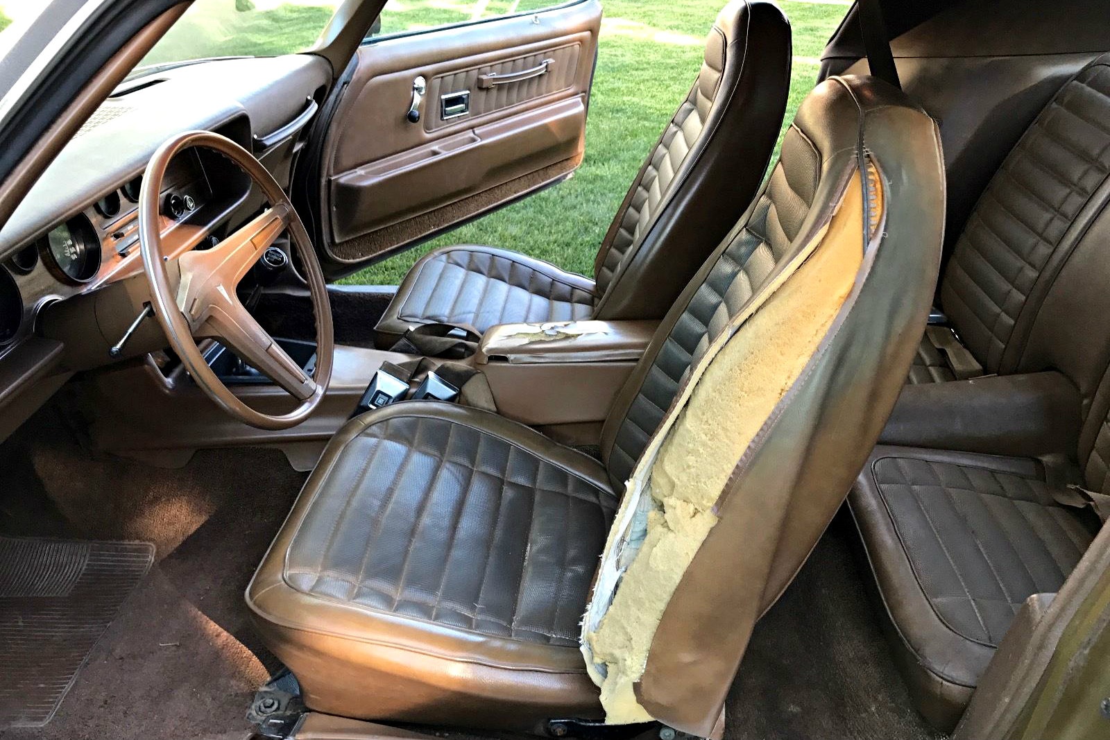 Very original, but in need of some help, the interior isn’t too shabby. The driver seat is split like a hot dog bun, and the center console lid has some cracking in the vinyl. Oddly the back seats and the carpet appear a bit dusty in appearance, but the rear seats almost look as if they have deteriorated from sun exposure, but it is difficult to make out. Despite these appearance details, the dash and door panels look excellent aside from the driver side arm rest area suffering from cracking. A solid cleaning and some upholstery work would do wonders for this Pontiac.