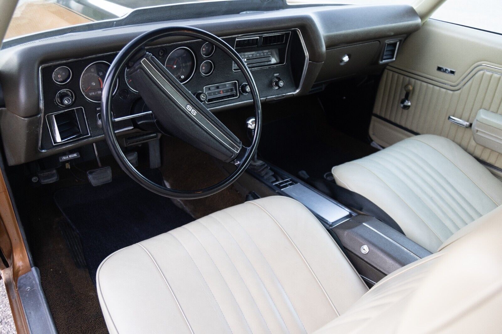 Besides a big engine, this Chevelle has a 4-speed manual transmission. The car is said to be in excellent running condition and no mention is made of any work having been done or needed. It’s a fully loaded automobile with bucket seats and a console, AM/FM stereo, factory air conditioning, and power steering and brakes. The gold paint was refinished in 1979 and perhaps the interior was, too.