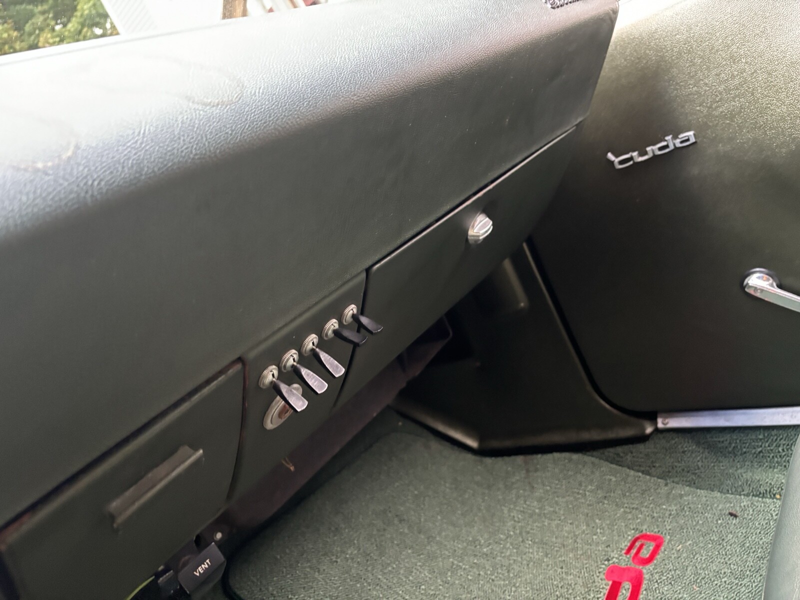 One area of this ‘Cuda needing nothing is its interior. It appears to have recently received a retrim, with the upholstered surfaces and carpet in as-new condition. The console and faux woodgrain are in good order, and there is a range of additional switches on the dash that have no stated purpose. It isn’t loaded with factory options, but the buyer receives a console, Rally gauges with a factory tachometer and an AM radio.