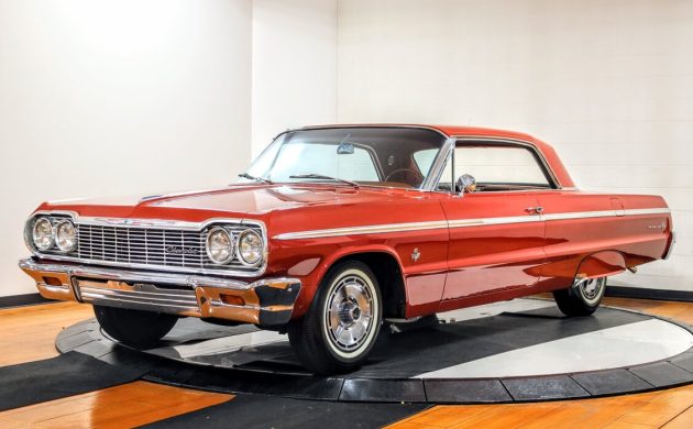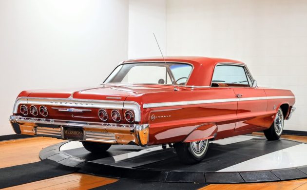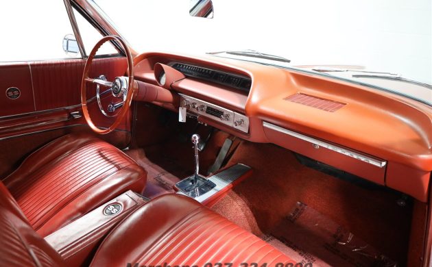 This 1964 Impala was ordered during the final year of Third Generation production, and, as the SS variant, it features beautiful engine-turned bright trim that stands out against the car’s dazzling Ember Red paint. The fender skirts accentuate the low, sleek lines, allowing the Impala to make a bold visual statement. Finding anything to criticize about the car’s presentation is seemingly impossible. What makes this classic particularly noteworthy is the fact that the paint is original. That is amazing when you scrutinize the images and discover how few imperfections it has accumulated in over six decades. This SS has a known ownership history and has only ventured from its warm, dry garage on weekends, making its lack of rust unsurprising. The glass is crystal clear, and the spinner wheel covers suit this car’s character perfectly.