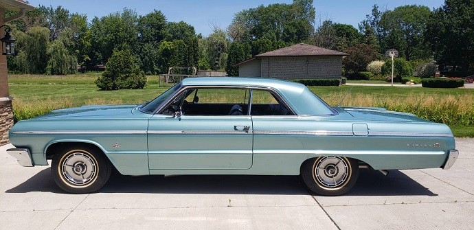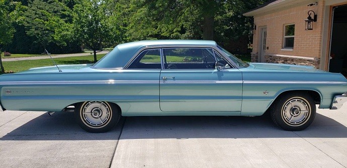 This is an attractive car with the SS package and those hubcaps. I owned two 1964 2 door hardtop Impalas one with a 283 and the other a 327(250hp) in that color. They were good cars with a nice ride. They had power steering and powerglides. I don’t remember the weights of those cars, but they weren’t that light and the 409 would have been a fun upgrade.