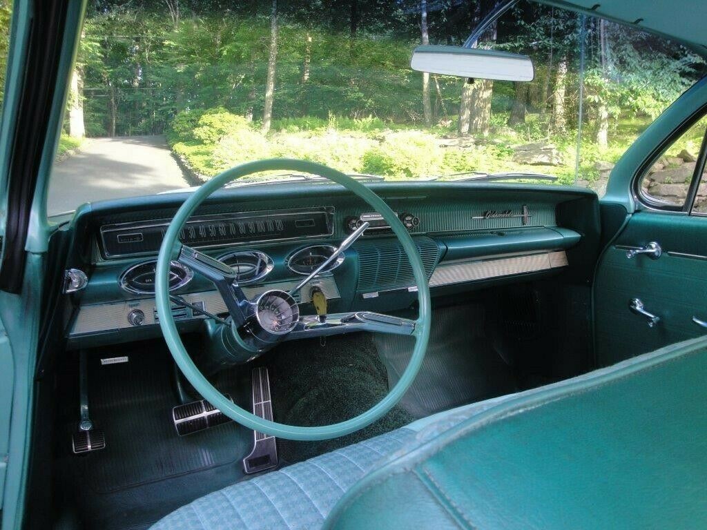 The 1961 model year marked a significant change for the 88. It received an all-new body and chassis, and the changes resulted in a car with a striking appearance. As was the case with most manufacturers, Oldsmobile said goodbye to the era of fins. However, the inclusion of downward fins at the bottom of the rear quarter panels gave the vehicle a distinctive appearance. The narrow pillars were also a great styling touch and made the 88 look light and airy. The Oldsmobile is finished in Tropic Mist, and the owner states that the majority of the paint is original. He believes that some of the panels might have been touched-up, but the paint on the horizontal surfaces is untouched. The vast expanses of glass appear to be in good condition. The owner notes some pitting on the rear bumper, but the remaining trim looks to be in good shape for a survivor.
