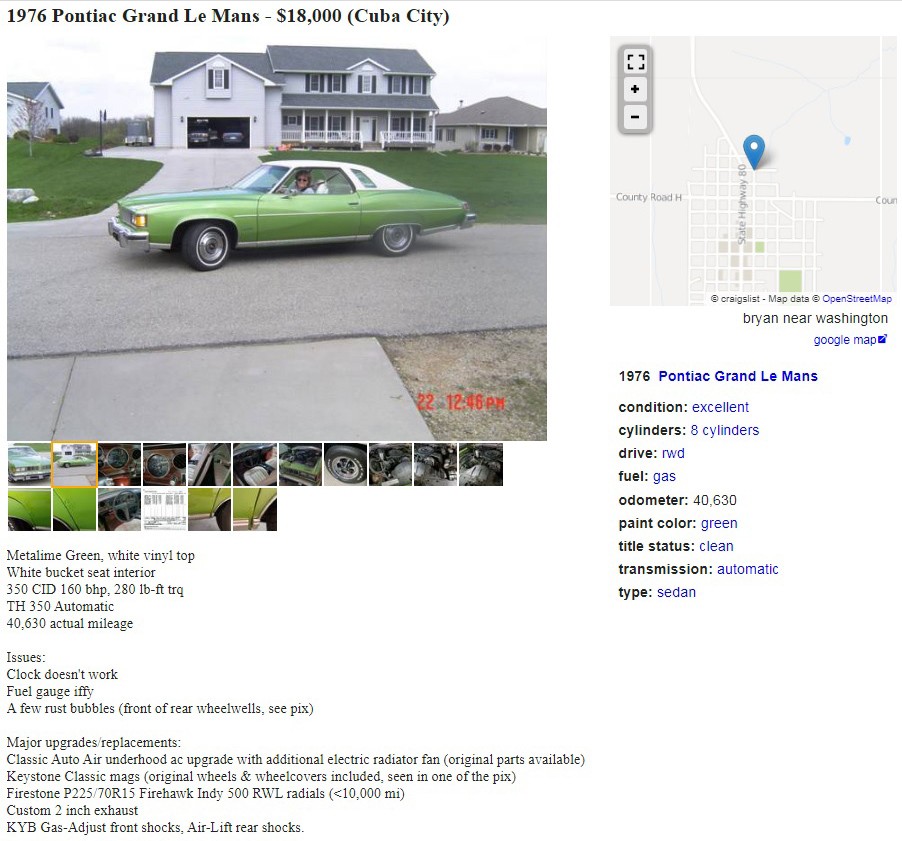 Metalime Green is an eye-popping color for this 1976 Pontiac Grand LeMans Coupe, touted in Pontiac advertising as “either one of the most practical luxurious cars or one of the most luxurious practical cars Pontiac ever built.” The seller has this colorful coupe posted here on craigslist in Cuba City, Wisconsin, and they’re asking $18,000. Here is the original listing, and thanks to Tony P. for the tip!