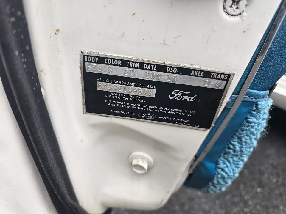 As soon as you open the door, you can tell it’s a ’65 rather than a ’64 by the big, proud “Disc Brake” rotor on the brake pedal. The Landau Coupe had a wood-trimmed interior, but this one’s a bit of a mystery. The trim tag doesn’t quite match up with what’s in front of us. It’s a Landau all right, but the fake C-Pillar irons have been replaced by standard T-Bird ornaments, while the interior is missing its wood grain steering wheel and door panel inserts. Based on my notes, the exterior was originally Dark Gray (or Charcoal Gray) and the interior a harmonizing silver, so the white exterior and aqua interior tell us that this car has undergone a big change, likely during a prior restoration. Luckily, many people in the four-seat Thunderbird world aren’t sticklers for strict originality. Regardless, the T-Bird’s interior would arguably never look this good again beyond the 1966 model year.