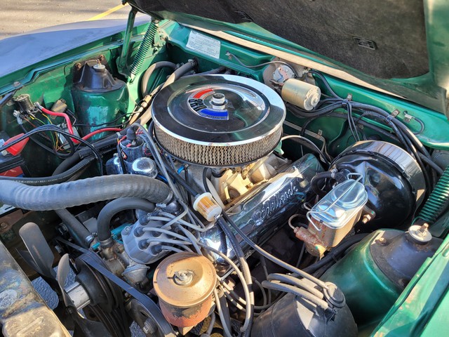 With only 40,000 miles on the odometer, this Javelin has averaged less than a thousand miles a year over the past half-century. The body is solid and rust-free; the owner indicates that it spent most of its life garaged and in a mild climate. The muscular appearance of the second-generation body is enhanced by the chrome mag wheels with BF Goodrich white letter tires. The metallic green paint is original with some dings and thin spots, the worst area being the front right fender which has some black primer on it. The original white and red striping along the beltline is present, though there is some cracking from age. The engine compartment is also well-preserved with its original stickers present, and a clean 360 V8 with a chrome air cleaner and Edelbrock valve covers. This engine is said to run well and delivers its power through a smoothly shifting automatic transmission.