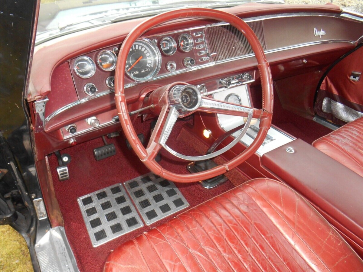 I did some research and was quite surprised to discover this car’s shifter is in the correct position, NEXT to the console! Here’s a photo of a ’64 300K showing the same shifter & location with a black interior. It wasn’t until the 1965’s wider console allowed the shifter mechanism to be re-located.