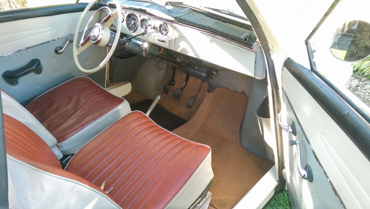 I drove mine for a couple of years until a gasoline jockey in New Jersey (you still can’t pump your own gas in NJ) failed to put all of the oil from the can into the gas tank. The engine seized at 65mph on I-80 around Patterson, NJ. Fortunately, the free-wheel was working and I still have my feet and ankles. It was a very well-made and well-engineered car. It was seriously underpowered and the front drum brakes on my ’66 were not great, but the fit and finish were excellent. The seats were cloth and matched the door cards and were very comfortable on long rides. 4 speed column shift with reverse being strange – pull lever out, back, and down. The v4 was a much better choice and I think they later added front disk brakes. I’d love to find another one for a decent price.