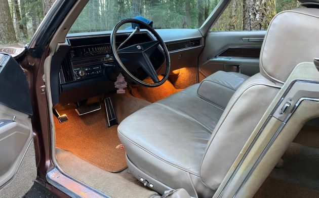 I’m trying to ascertain this Coupe Deville’s hue, and I think it’s either Chateau Mauve Firemist or Chalice Gold Firemist, but I cannot tell with certainty. In some images, it shows as a dark red/purple shade, while in others, it looks brown. Regardless, it presents beautifully with a nice shine and depth. The seller adds, “It was stored in a garage since 1980…the exterior has some parking lot dings & scratches like a late model car, no rust or damage a coat of paint would make this a serious show car.” From what I can spy, a “coat of paint” (let’s call it a professional respray – it’s not a fence) would be superfluous – it’s fine as is. The contrasting vinyl top covering is said to be original, and it is well preserved and not afflicted with the foibles that so often plague that feature. The only detraction, and it’s subjective, are the 1977 vintage wire wheel covers – I’d prefer the original pieces, and for those who feel the same way, they’re included in the sale.
