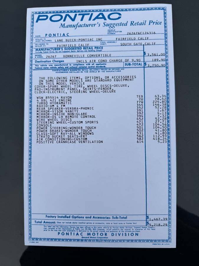 The seller unfortunately doesn’t include any engine compartment photos, but the basic 421 was a $78.42 option over the standard 333-horsepower 389. It only gave buyers an extra five horsepower, but the additional 30 lb.-ft. of torque (459 vs. 429) would be noticeable when piloting a heavy Bonneville ragtop. The standard axle ratio was a 2.93:1 with air conditioning, so modern expressway speeds will be no problem for the new owner.
