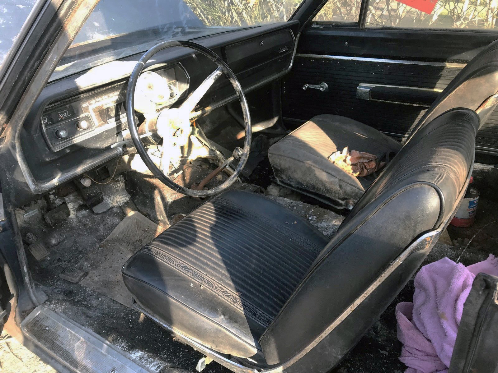The interior looks surprisingly good, despite being as dirty as (insert un-pc phrase here). And, that 4-speed! If this car doesn’t grow hair on your knuckles you aren’t alive! This was originally a blue car, I wonder if it was the same light poly blue as this gorgeous car that was sold at a Barrett-Jackson auction in 2012? That car went for $64,900, don’t expect this example to look like that for that price unless the next owner does most of the work her/himself. But, once it’s done it’ll be beautiful.