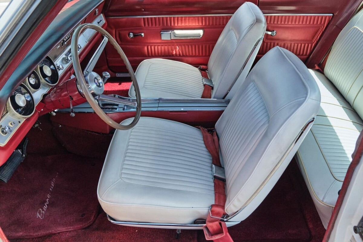 The interior is most certainly not original. It wasn’t until the late ’70s that white seats and door panels were available with anything but black accessories/trim. The interior may have been red and the seats and door and quarter trim cards replaced with white, or they may have recovered or replaced everything if a complete color change was involved.