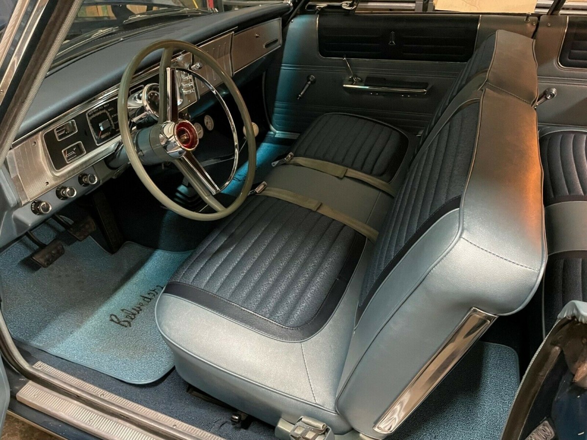 This ’65 Belvedere II is said to be cosmetically original, wearing its factory blue (with a hint of turquoise) paint. It has a few little nicks and chips which you would expect after 56 years. All the chrome and stainless trim all present well as does the undercarriage which was undercoated at the assembly plant. We’re told there is no rust on the car even though the seller has been looking carefully. The interior is original and well-preserved, with a bench seat as opposed to buckets that you’d find in the car’s upscale brother, the Belvedere Satellite.