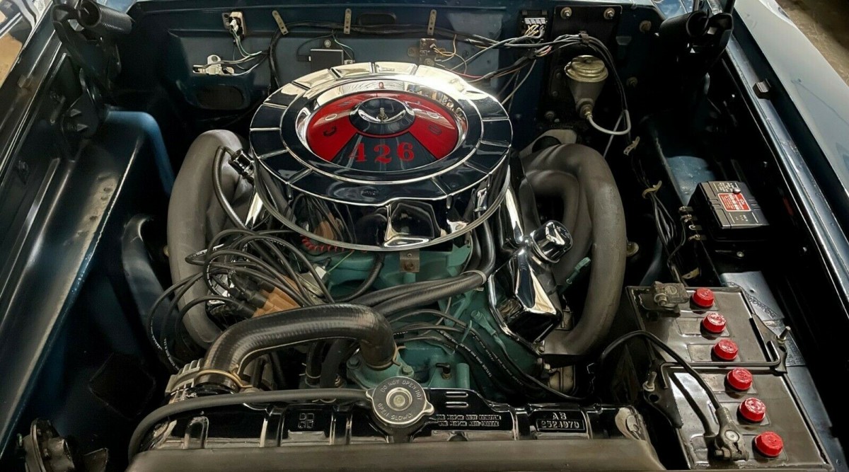 Russ, The ad says the motor is a 426 street wedge, not a Hemi. 426 street wedge is a cousin of the “RB” series 413 and 440 motors. Hemi is a whole different story. You can see the difference from 15 feet. A Hemi has the spark plugs in the middle of the valve covers, this one doesn’t.