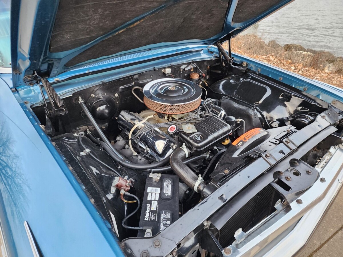 The unrestored theme continues when we focus on this Galaxie’s interior. The original owner ordered it trimmed in Code 72 Medium Blue and Light Blue Diamond Lustre vinyl. As with the exterior, it is hard to find anything to criticize inside this classic. The upholstered surfaces sport nothing beyond a few wrinkles on the seats, with no evidence of wear or abuse. The same is true of the carpet, while the dash pad has no fading or UV damage. The bright trim pieces look excellent, as does the wheel. After owning the car for a short period, the original owner returned it to the dealership to add a Faria dash-mounted tachometer and air conditioning. It appears someone has since removed the A/C, which probably isn’t a drama because it doesn’t impact the vehicle’s originality.