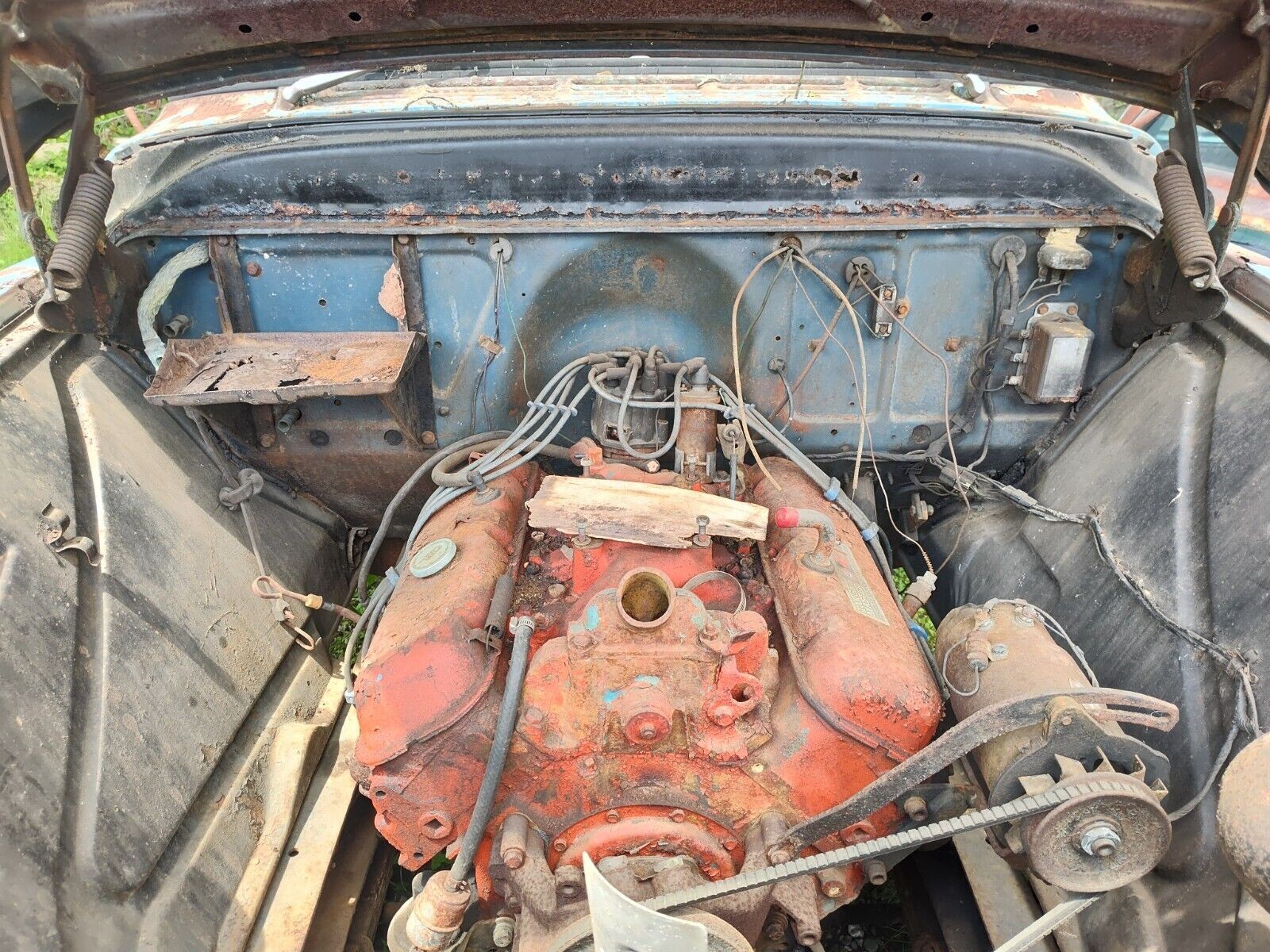 Looks like a high-deck engine. It could be a 427 or a 366. Either way, it looks impressive in that bay. Of course the first thing I would do was see if the engine was stuck. Finished up that could make a good trailer puller…