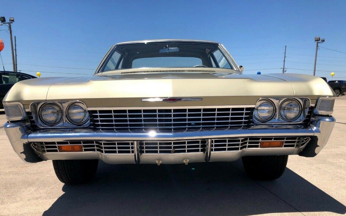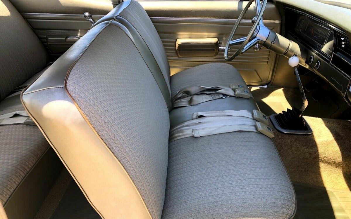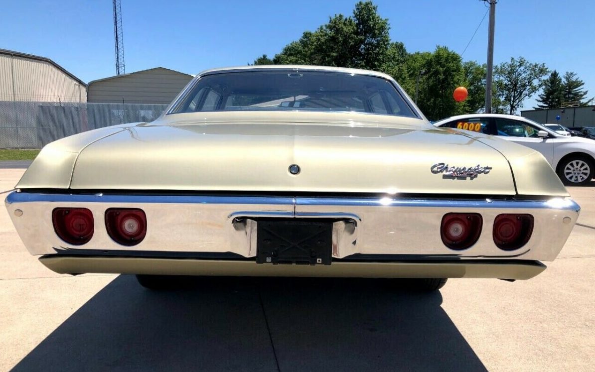 At first blush, I was convinced that I had seen this Biscayne before. I stumbled upon a very similar example at an auction in Daytona Beach about ten years ago – the authenticity was remarkable. Upon closer examination, this is not the same car, but it’s close! The VIN checks out, it’s a V8 powered Biscayne coupe, built the third week of July 1968 at Chevrolet’s Lordstown, OH (now Lordstown Motors) assembly plant. Listed as a 37K mile example, this car is a mix of originality and modification. The trim tag indicates that this Chevy was originally finished in code G, Ash Gold Metallic and that is how it has been repainted. Considering the level of restoration, there’s probably no reason to assume that there are structural or integrity issues with this car – it looks perfect. A couple of quick observations, the black painted rally wheels are 18 inchers, way beyond what was available in ’68, the red Chevrolet bow-tie emblem on the header was reserved for the SS427 model only, as was the “427” emblem on the deck lid. While not original, these are all nice additions.