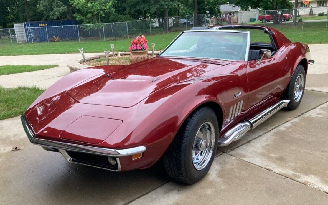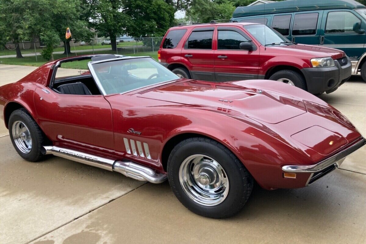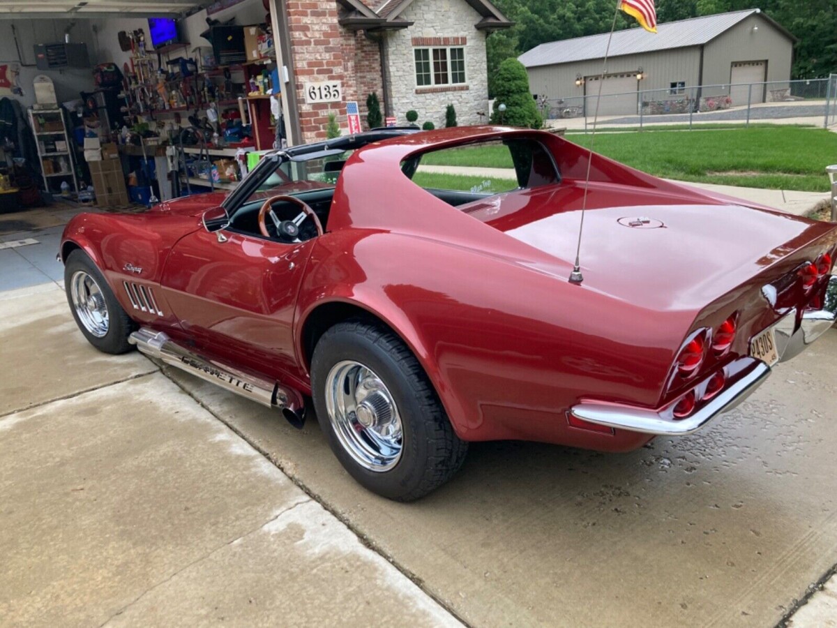 Lets devalue the vette! Aftermarket side pipes, goofy steering wheel, bubble tail lights and burgundy in color. 69 was the year for side pipes.