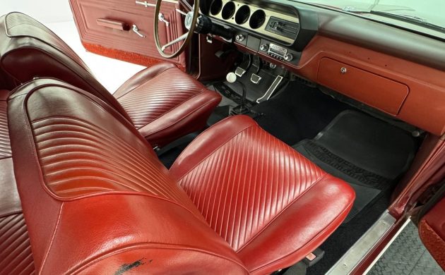 The Tempest’s interior is trimmed in Red vinyl mimicking the exterior paint shade. There is a minor rub on the outer edge of the passenger seat, but the rest of the trim looks very respectable. The gauge cluster is a modern product from the fine folk at Dakota Digital, and a purposeful Hurst shifter pokes through the floor. It is missing a couple of small badges, but if the buyer is satisfied with driver-grade presentation, this interior comfortably ticks that box.