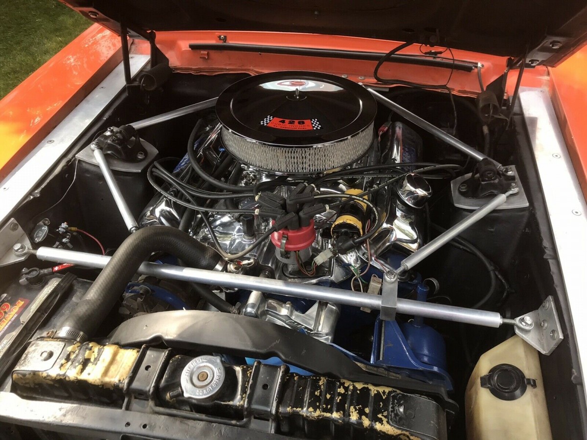 Really liking the 428 in there, its a beast without question. The tangerine color just hits me wrong, especially with that black scoop, maybe if it had torque thrusts or magnums the paint would appeal to me more. Hate the steering wheel, could live with the wood console the upgraded radio will sound just fine. So, if they’d left it white it could of passed for an early original Cobra Jet ’68 Mustang, one of those that came ready for drag racing, ha.