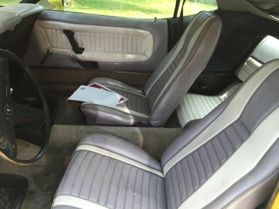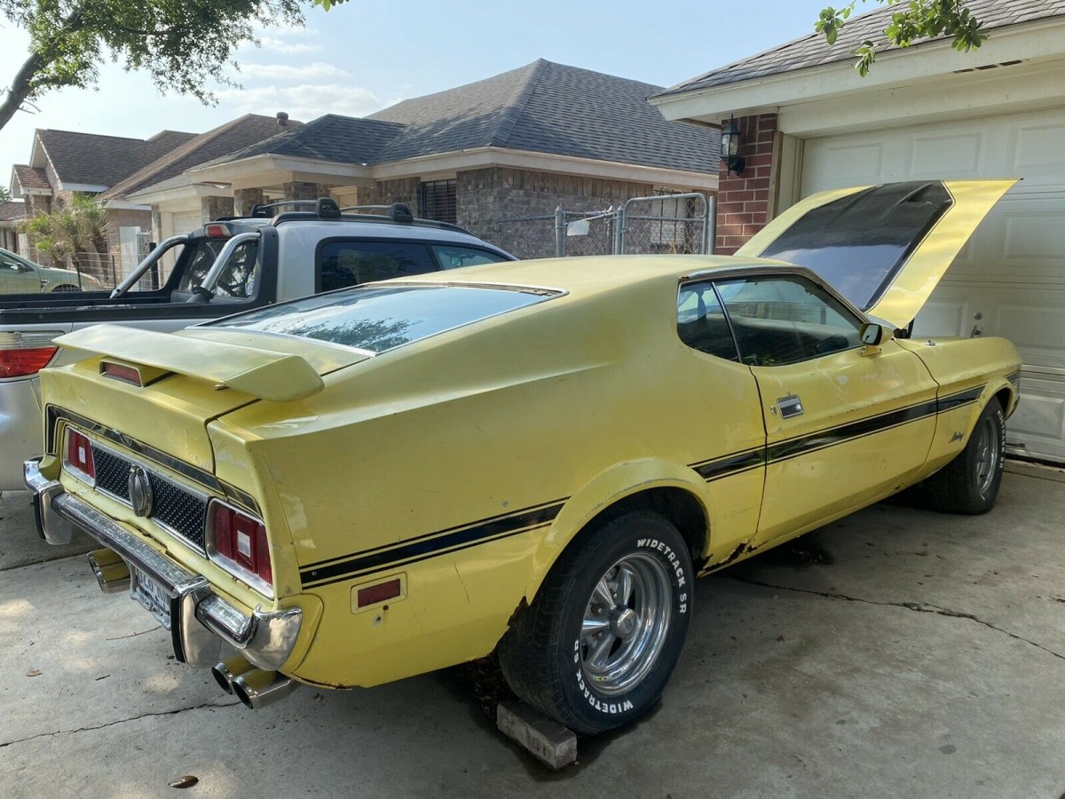 The seller tells us that this example comes with a 429ci engine and C6 3-speed automatic. I didn’t think that the 429 was offered in 1973, and I also think those decals don’t look like typical 1973 decals either. Could this perhaps actually be a 1971 Mach 1? Speaking of engine and transmission, neither one is completely installed here, and you can see quite a few little bits and pieces missing in the photo. There’s no mention of what their running condition is, either.
