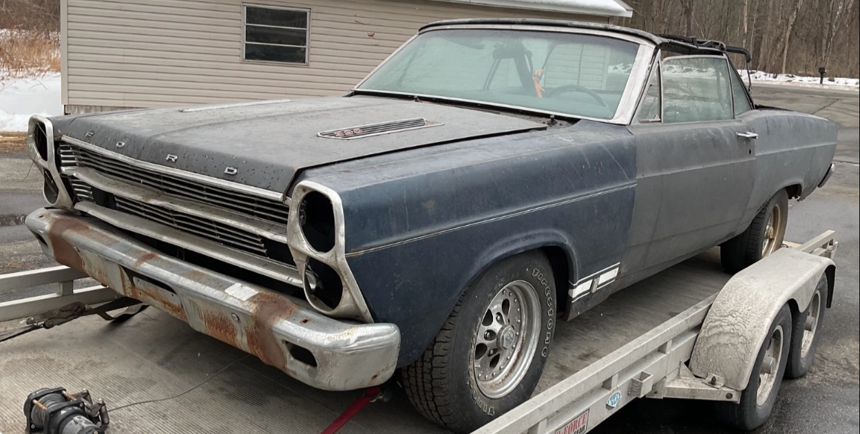The Fairlane was part of the Ford ensemble from 1955 to 1970. From 1962 forward, it was a mid-size car and gained stacked headlights in 1966 to match the bigger Ford. The seller’s ’66 Fairlane is a GTA, meaning it was a performance car with an automatic transmission (manuals were simply called GTs). Now sporting a 4-speed and an engine upgrade, this non-running project was a barn find in Ballston Spa, New York. The seller/flipper has priced it at $7,645.75 OBO here on eBay.