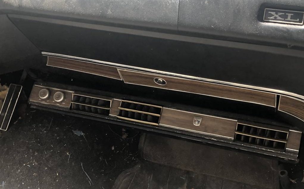 It’s easy to imagine that the interior, as the seller references, is in rough shape. There are two images of door panels that look OK and one of the Ford dealership add-on A/C unit but none of the general upholstery. The door panels actually look pretty good but the dash pad is cracked. And that’s about it for the interior.