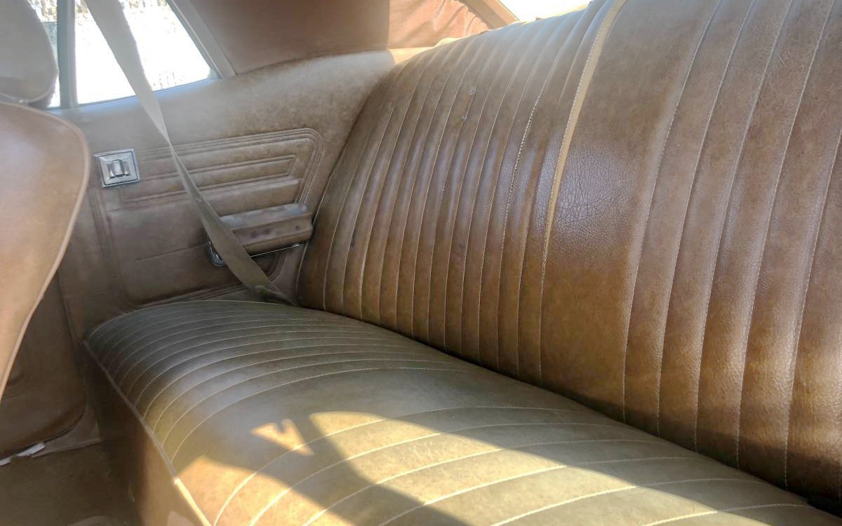 The seller also mentions that there is some former rust repair in the trunk which isn’t shown at all, but they do show a spot with obvious bodywork here behind a quarter panel and some behind the vinyl top. They say that it was a one-family-owned car before they got it and you can see that the interior needs help, again from that hot sun.