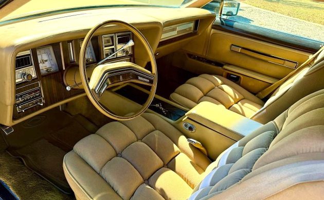 Words such as elegant and extravagant come to mind when evaluating this car, and for the period, the Diamond Jubilee Mark V was about as high-level as could be had for a domestic personal luxury coupe. Only two colors were available, including Diamond Blue and Jubilee Gold, with this one still wearing its original gold paint. The Diamond Jubilee also got buyers a color-matching grille, side moldings, wheels, plus vinyl on the top and Continental tire area on the trunk lid. The seller mentions a bit of patina showing on the finish, but this one still looks quite good for its age, and I’d probably leave the outside alone for as long as possible.