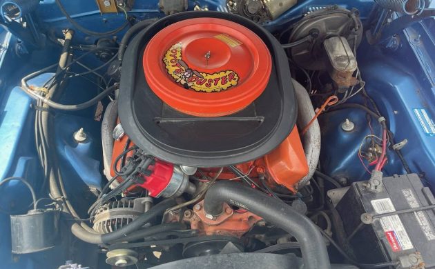 This Road Runner’s interior is as impressive as its exterior, trimmed in a sea of Blue vinyl. I can’t spot many areas deserving criticism, although there are a few carpet stains. I am torn as to whether the dashpad has split, with the photo quality too poor to make a definite call. However, if it is unrestored, it demonstrates that this classic has been treated respectfully since Day One. The under-dash CD player, gauge, and wheel wrap are the only visible additions. The first owner didn’t load it with options, although the Rally gauges, factory tachometer, and the beautiful pistol grip shifter are all purposeful.