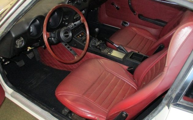 The seller describes this Datsun’s interior as “desirable Maroon,” although the factory called it Red in its marketing literature. One fact that they fail to mention is that this was the sole interior trim available to buyers ordering a ’73 Datsun 240Z in White. I will forgive that, because the overall condition is well above average. There is a small tear on the lower outer edge of the driver’s seat that might be repairable. Otherwise, this interior is remarkably clean. Dashpads are prone to cracking, particularly above the center gauge cluster. This one has avoided that fate, while the quilted vinyl on the transmission tunnel is wear-free. This car retains its factory AM/FM radio, avoiding the curse of aftermarket stereos. The original wood-rimmed wheel is intact, and the gauges look crisp and clean.