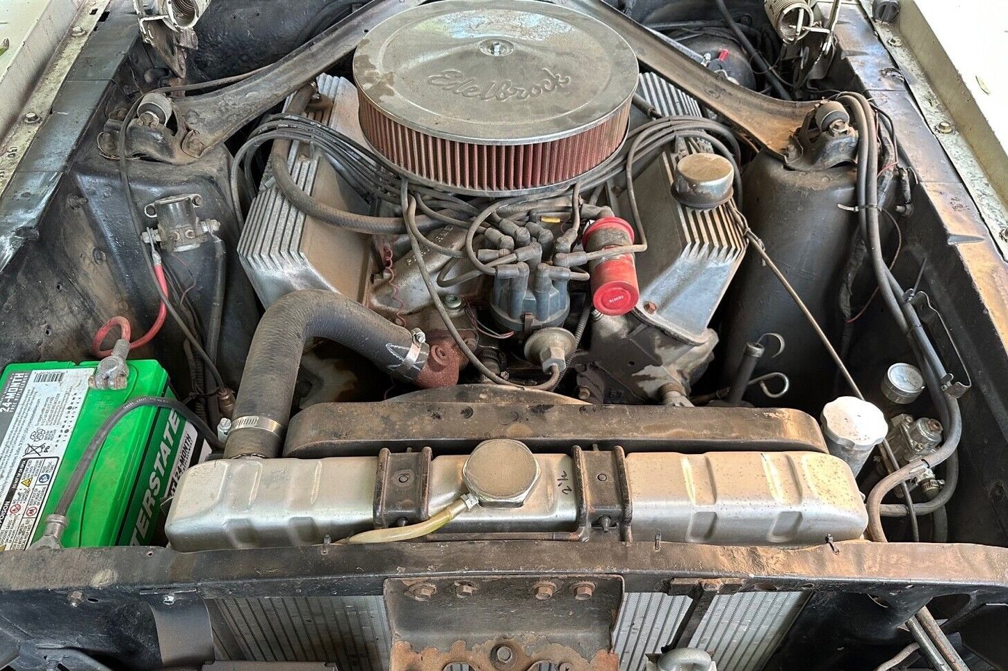 It looks to me like the car has had at least one repaint as the pinstriping is gone. It is also missing the rear quarter “Cougar” emblems. So were the mounting holes just filled in? Or did the car have quarter panels put on it? The car has definitely had some parts replaced as the left headlight assembly is from a 1968 Cougar. I am not so sure that the wheels are the original ones. An original 1967 styled steel wheel is 5 1/2 inches wide, the wheels on this car look to be wider than that. Perhaps that is just an illusion on my part. It is also missing most of the underhood A/C parts.