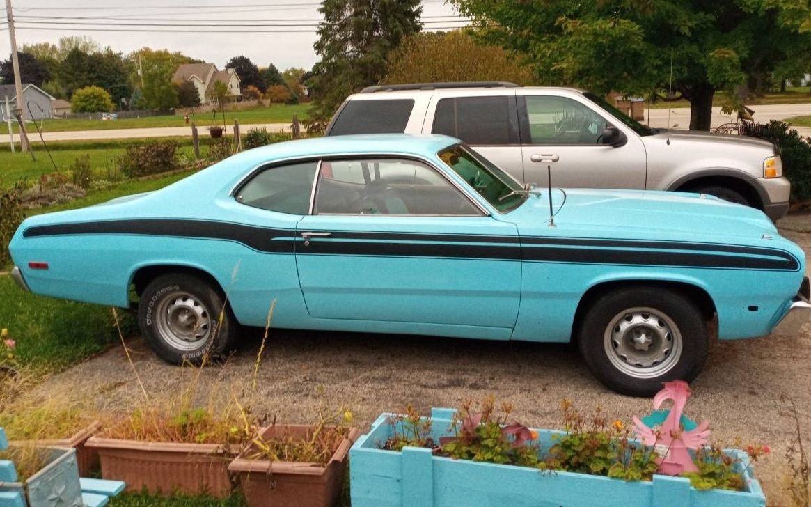 There is no apparent rust to worry about and the interior looks to have been refreshed, with seat covers that match the exterior of the car. The paint color is so popular it looks as though the seller painted his flowerpots and benches to match the car! In good condition, Hagerty estimates a ’74 Duster in good condition is a $9,000 car, so the seller’s asking price provides plenty of room the get the remaining work done.