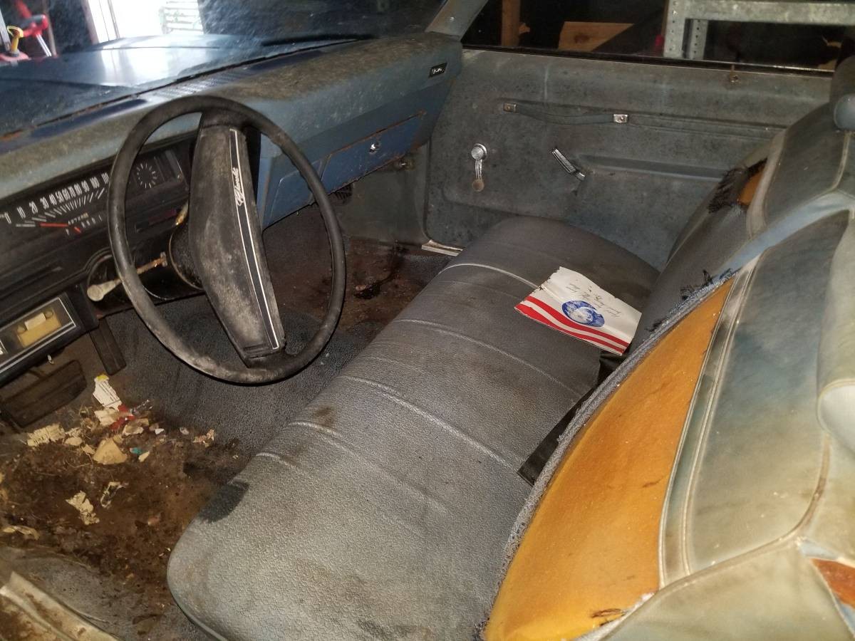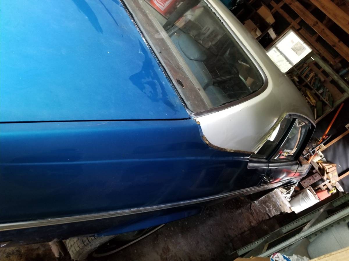 There’s no reference to the condition of the car other than “the usual wear for the age.” We don’t see any obvious rust in the pictures and the white over blue two-tone paint was an attractive choice. The driver’s side wiper blade is missing altogether, there could be damage to the panel below it and the rear bumper has a pretty sizeable dent in it. When you look inside, the front seat is trashed as is what’s left of the front carpeting. Not sure what’s going on with the rear seat.