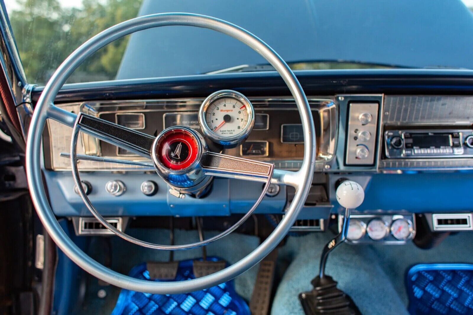 The first thing I noticed about this Belvedere’s interior wasn’t its spotless presentation but the lurid blue floor mats. They are entirely out of character because the remaining trim is a classy combination of two-tone blue vinyl. The front seat shows no signs of wear, and the back seat looks like it has hardly been used. I suspect the interior received a retrim during the build because there is nothing worth criticizing…except those mats! It isn’t completely original, but the additions are practical and will be welcomed by the winning bidder. The car features aftermarket air conditioning, a retro-style stereo, a gauge cluster under the dash to monitor the beast under the hood, a Hurst shifter for precise ratio selection, and a column-mounted Sunpro tach so the driver can take it to the max.