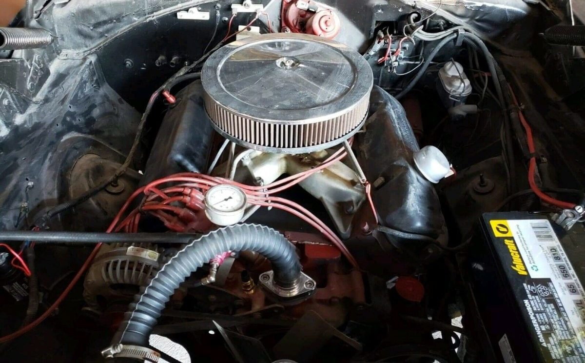 The interior appears to be in fairly decent condition, with new front seats and a new steering wheel. The ad states that new gauges and a new headliner are also included. The floor pans have been patched but could use some finishing as they have been topped off with what appears to be Bondo. The remainder of the interior could use a good cleaning, and the new owner should have no problem locating replacement parts for items such as the door panels and carpet as needed. The ad shows the back seat in place in one photo and removed in another, so it’s safe to assume that it is at least included if not installed. There’s a fuel cell located in the trunk, but the seller doesn’t mention if it is functional or if the stock tank is still in place.