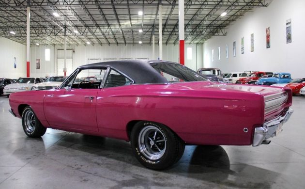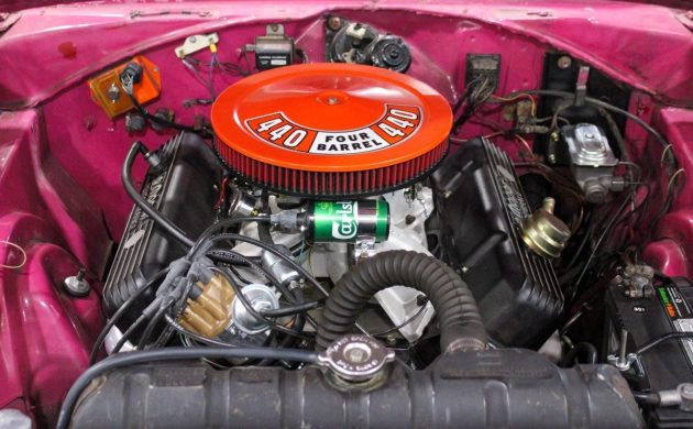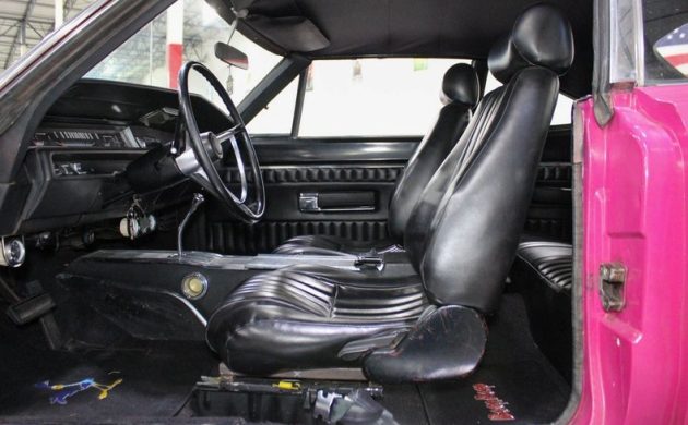 Chrysler paint code FM3 is one of the wildest colors ever to adorn a Mopar, or any other automobile, for that matter. Known as Moulin Rouge at Plymouth or Panther Pink for Dodge, it was one of the short-lived High Impact paint offerings, first available in early 1970. Obviously, there’s no way this ’68 Road Runner could have come from the factory looking like this, and the seller reports that the original color was red. The finish appears decent in some areas, but a close inspection reveals a few touched-up blemishes, plus a couple of areas where light rust is starting to show through as well.