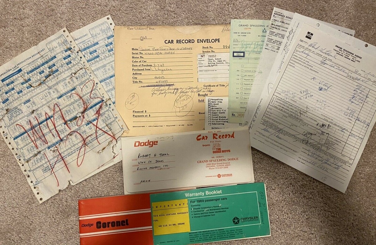 Documentation is another strength of this car. It comes with paperwork from the original purchase in 1969 along with two build sheets, the window sticker, and the owner’s manual. The fender tag is still in place, all the body numbers are said to match along with the engine, which has been taken apart but not shown in any of the photos. The laundry list of date codes is rather extensive. We’re told the Dodge comes with a 4-speed manual and the claimed mileage is just 25,000.
