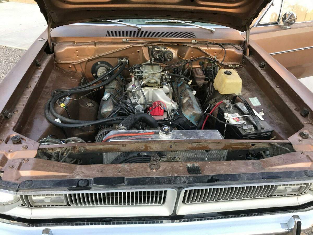 The body looks good with nothing more than surface rust where the paint is chipping. The paint is rather sad looking, but a good wax job might help it last a bit longer. The vinyl top may be okay, but the dark colors make it hard to determine if anything nasty is brewing under the material. Perhaps the place to start with in making the car presentable is with the interior. The upholstery is shot, the door panels worn, and the dash and steering wheel cracked. We’re told the carpeting and headliner are okay, but they’ll just look old if you replace the rest, so break down and do it all. The odometer reflects 37,000 miles, but the seller is certainly that has turned over.